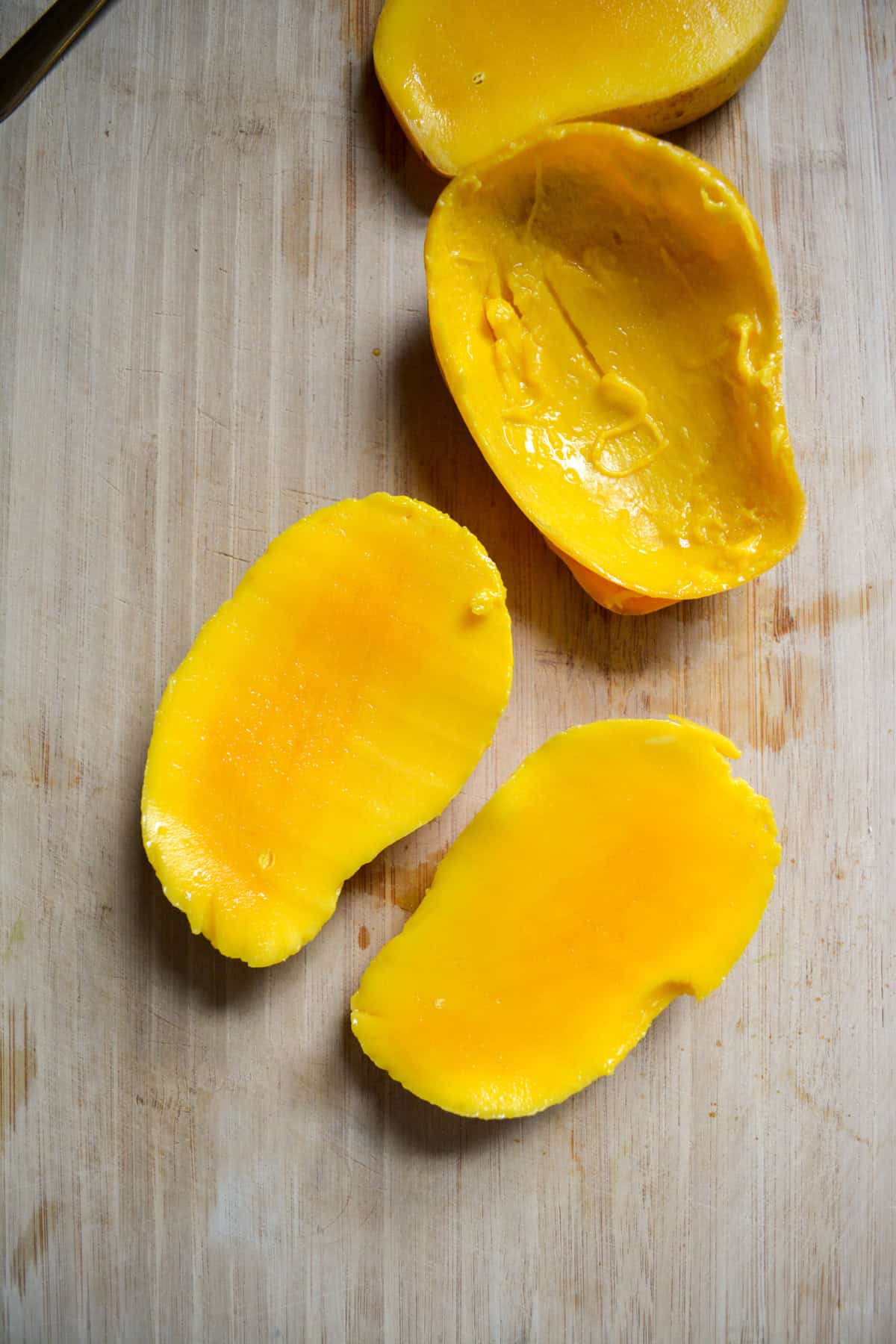 Step 1. First, use a chef's knife to cut the mango cheeks away from the large center pit.